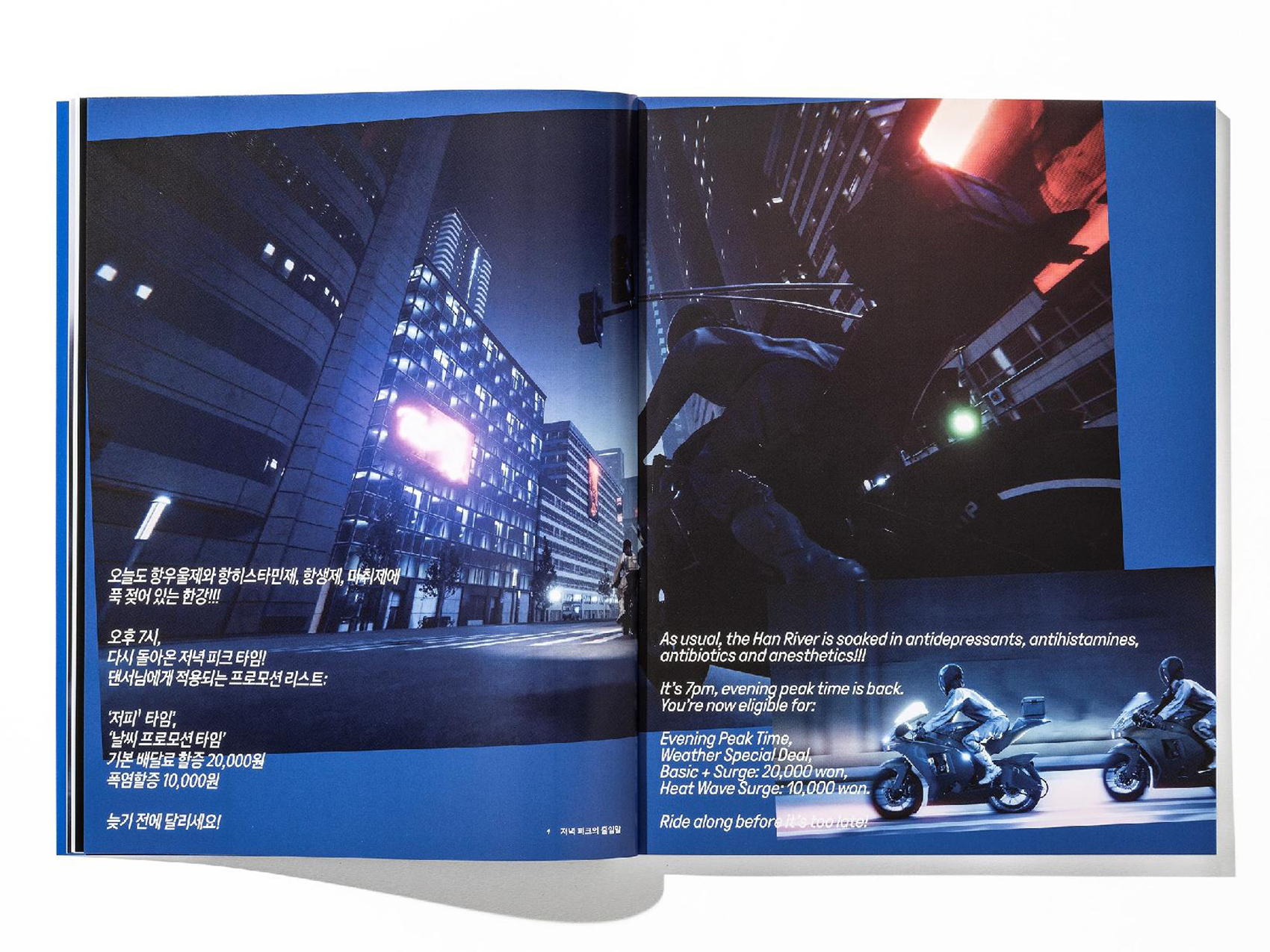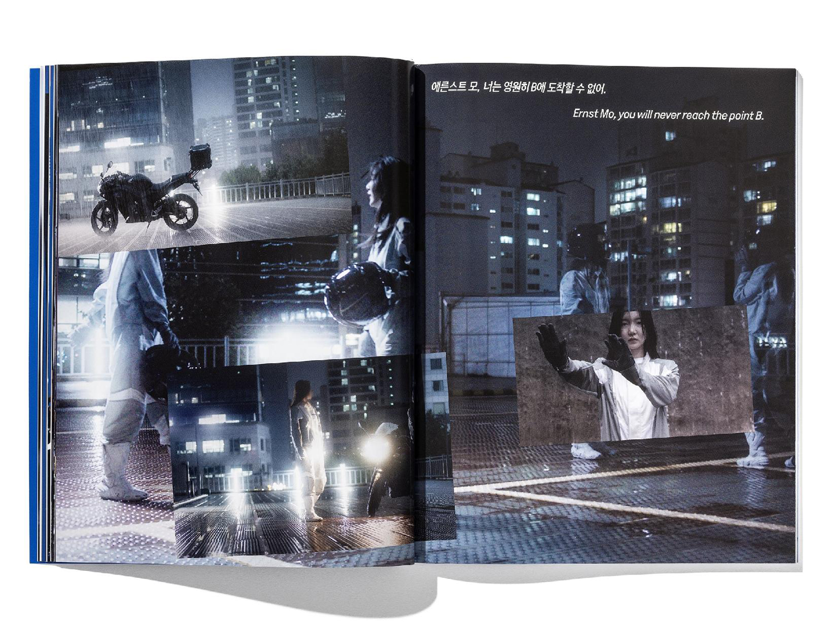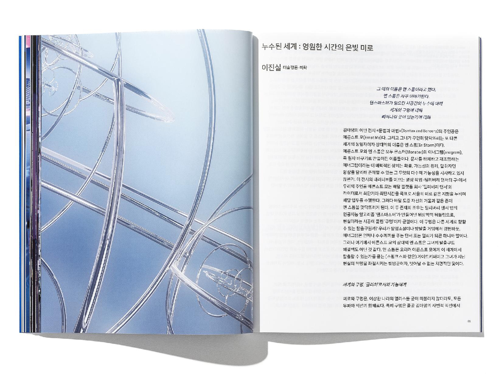 This is the exhibition catalogue for Ayoung Kim’s solo exhibition Syntax and Sorcery that opened in Gallery Hyundai. The catalogue presents 11 works including still images from Delivery Dancer’s Sphere, excerpts from the script, images of the installations derived from the main video work, a series of Orbit Dance sculptures that embody the concept of the exhibition, and a wallpaper collaboration with a webtoon artist 1172. Also featured is an essay by art critic Jinshil Lee, “Leaked World: The Silver Maze of Eternal Time,” which analyzes the exhibition with keywords such as possible worlds, algorithms and cyborg laborers.