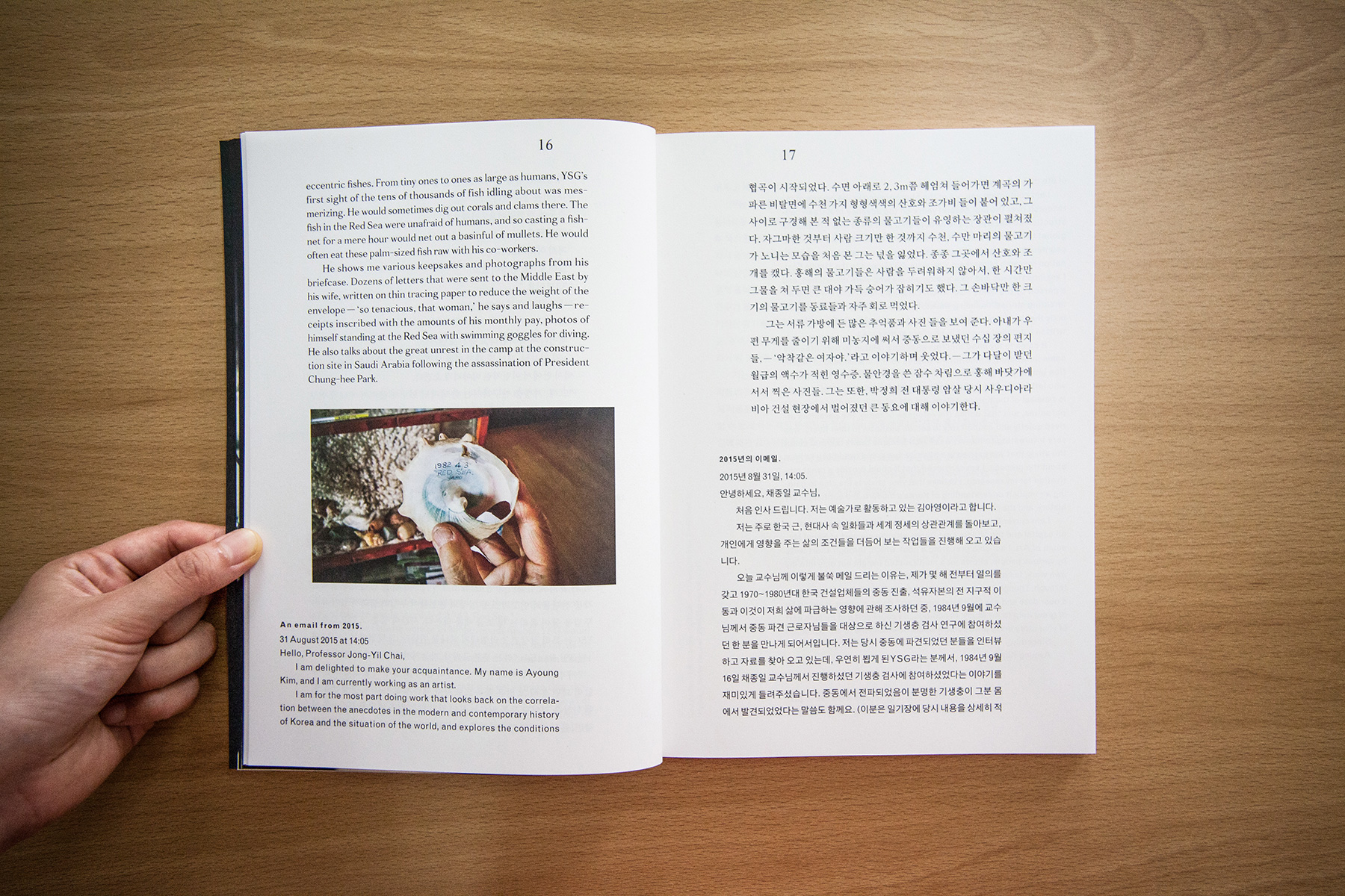 “2015년 9월, 나는 YSG의 자택을 방문한다. 크고 작은 식물 화분들로 예상치 못하게 우거진 23층의 베란다-공중정원에서는 한강과, 그 너머 저 멀리에서 공사중인 제 2 롯데월드 타워가 내다보인다. 현관 옆, 거실 한 켠에는 산호와 갖가지 소라껍데기, 조가비가 수북이 든 유리 장식장이 놓여 있다. 시간이 멈춘 그 안으로부터 YSG는 특히 잘생긴 소라껍데기 하나를 꺼낸다. 그 밑면에는 “1982년 4월 3일, Red Sea.”라는 푸른 글씨가, 가늘지만 선명하게 적혀 있다.”